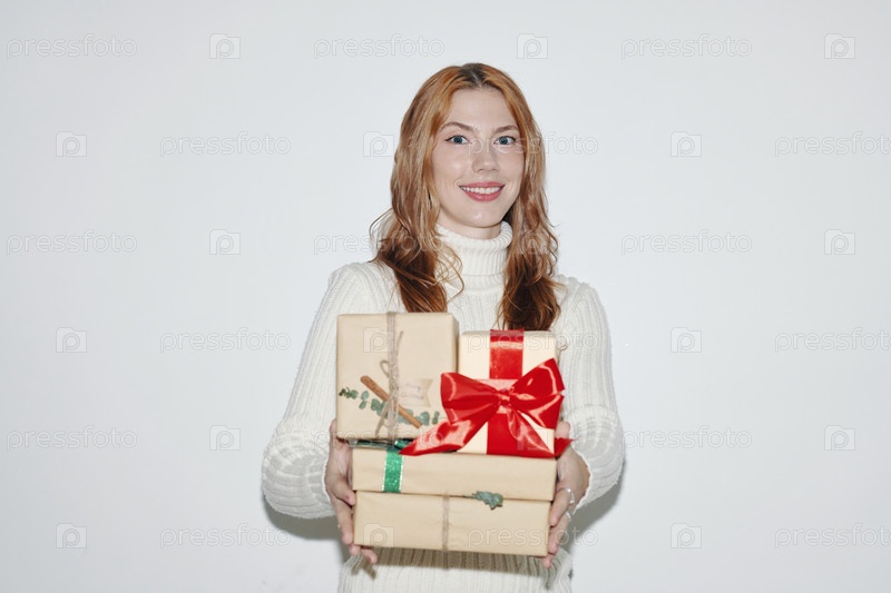 Портрет женщины, держащей подарки с яркой улыбкой