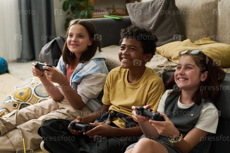 Улыбающиеся дети играют в видеоигры внутри дома на диване