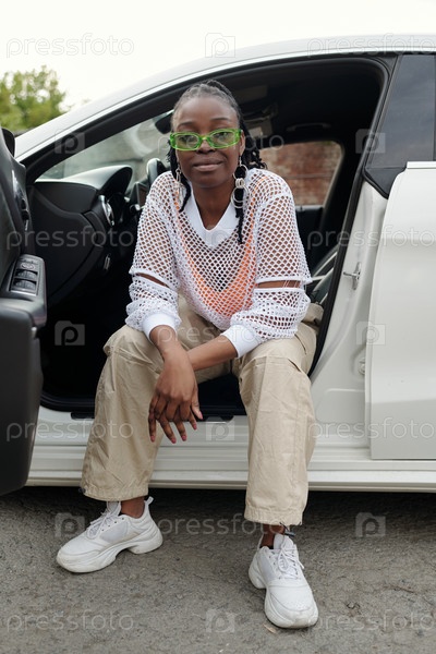 Молодая женщина сидит у двери автомобиля, нося очки