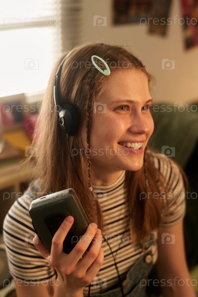 Улыбающаяся молодая женщина держит смартфон с наушниками