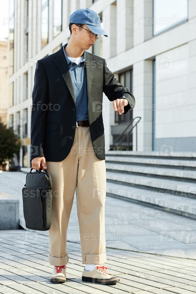 Азиатский мужчина с сумкой для ноутбука ходит, глядя на наручные часы в городской улице