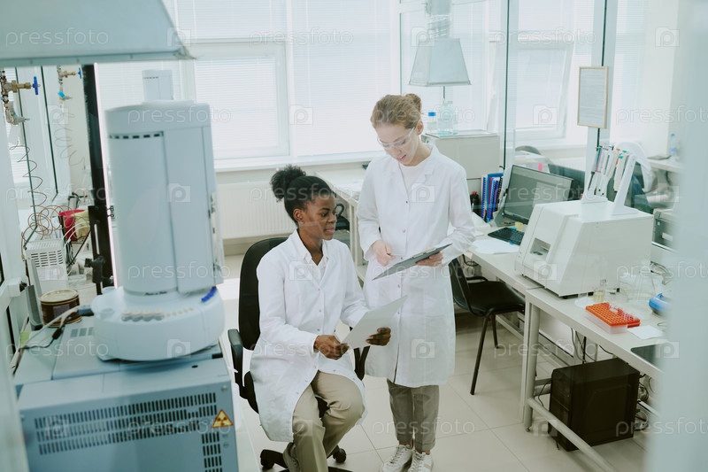 Сотрудничающие ученые просматривают исследовательские данные