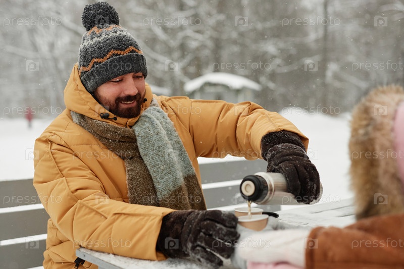 Улыбающийся отец наливает горячий чай