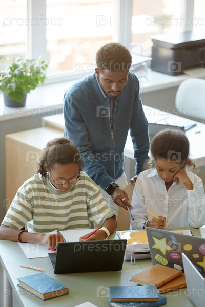 Угловой снимок чернокожего учителя средней школы, помогающего двум ученикам