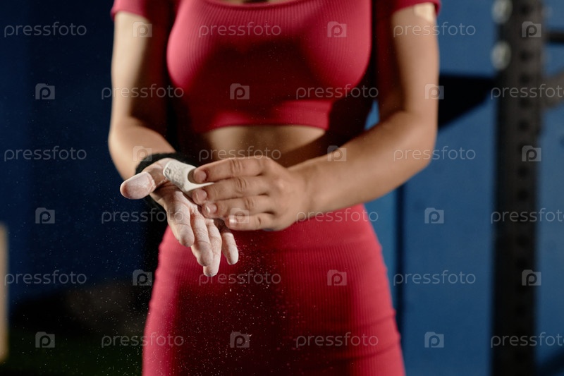 Руки женской гимнастки Чалкинг руками, протирающими магнезию в ладоши в тренажерном зале