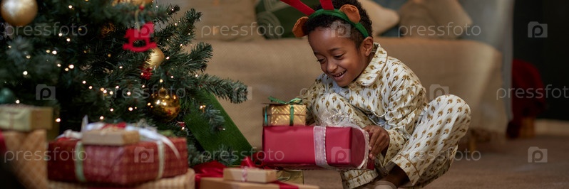 Header Image of Ребенок открывает подарки на Рождество в пижаме