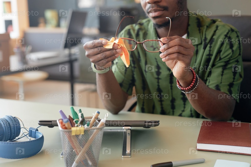 Близкий снимок чернокожего мужчины, убирающего очки, сидящего за рабочим столом