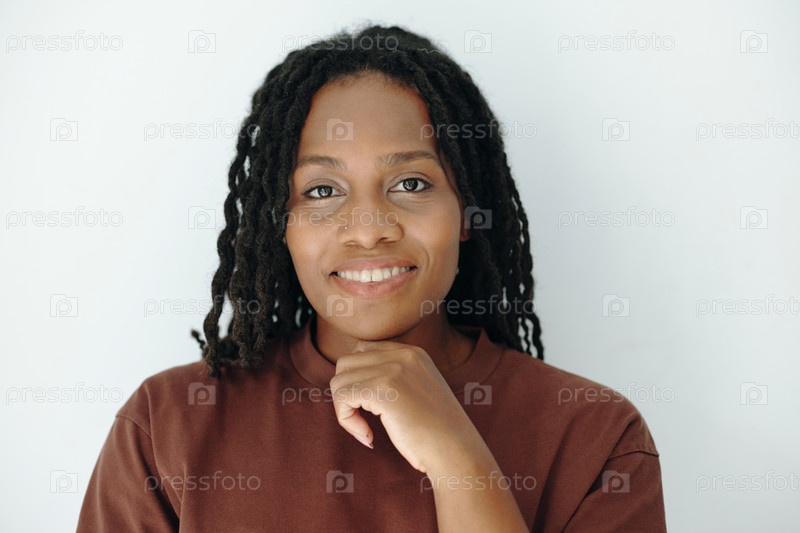 Портрет молодой женщины с рукой под подбородком, улыбающейся