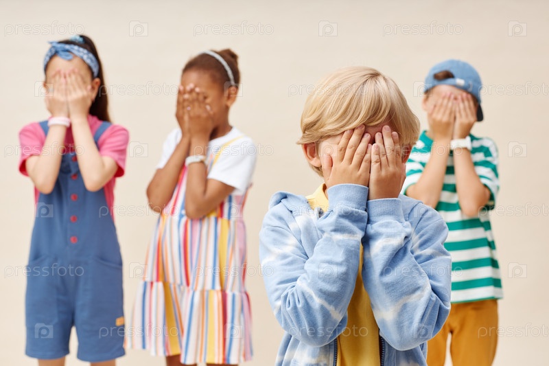 Четверо напуганных детей в возрасте до 19 лет играют, закрывая глаза руками в студии