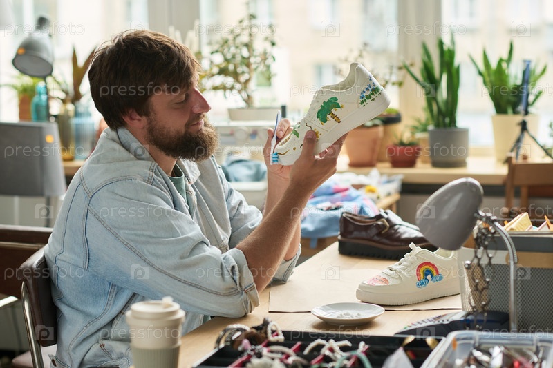 Работник магазина подержанных товаров чистит кроссовки