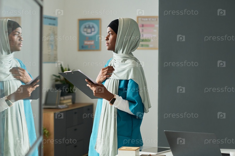 Молодая мусульманка в хиджабе анализирует отражение работы