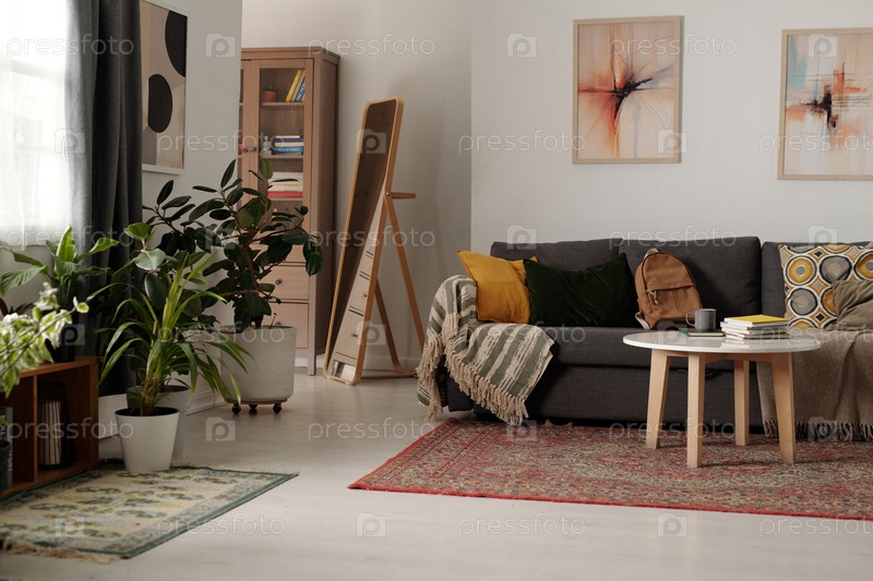 Уютная гостиная с современным искусством и растениями
