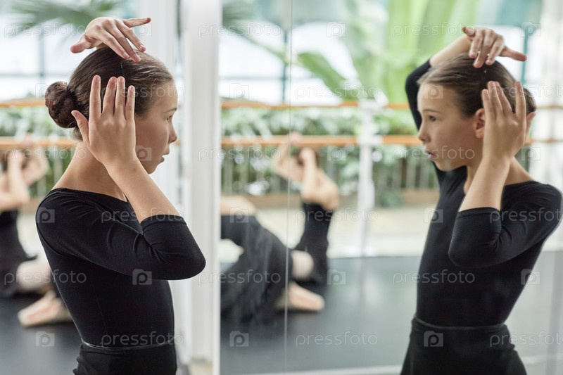 Танцовщица балета стилизует прическу с помощью застежки для волос, глядя в зеркало в студии