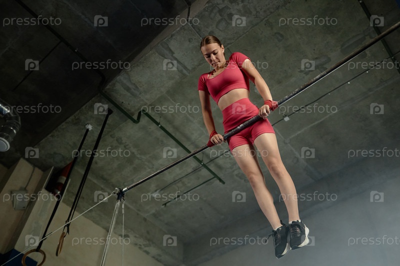 Женщина-спортсменка, занимающаяся гимнастикой Kip Pulling up onto High Bar in Gym