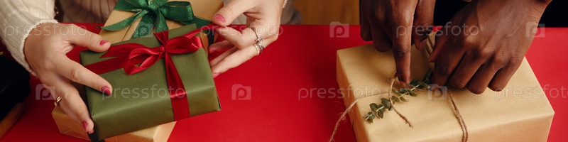 Обмен продуманными праздничными подарками на красном столе
