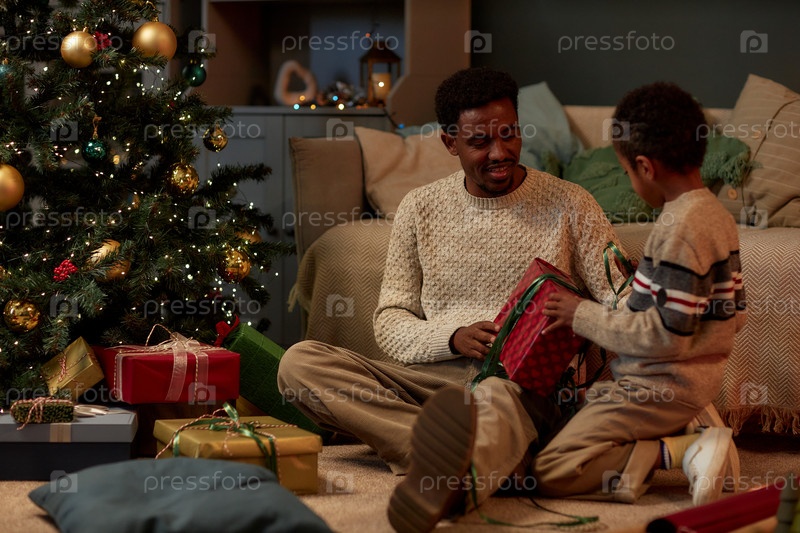 Отец и сын открывают рождественские подарки дома