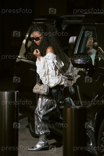 Женская знаменитость в серебряном наряде выходит из машины ночью на улице