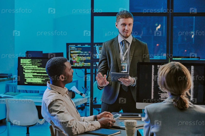 Специалист по кибербезопасности делится своими идеями во время совещания в офисе