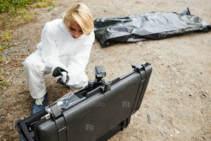 Женщина в Hazmat Gear, использующая оборудование на месте преступления