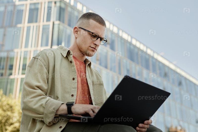 Бизнесмен в очках использует ноутбук для работы на открытом воздухе в городе