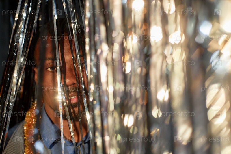 Портрет чернокожего мужчины, стоящего в партийной фольге занавесок