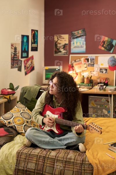 Играть на электрической гитаре в постели в уютной спальне