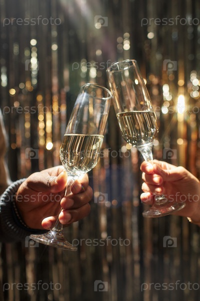Руки хлопают чашками шампанского во время празднования Рождества на домашней вечеринке