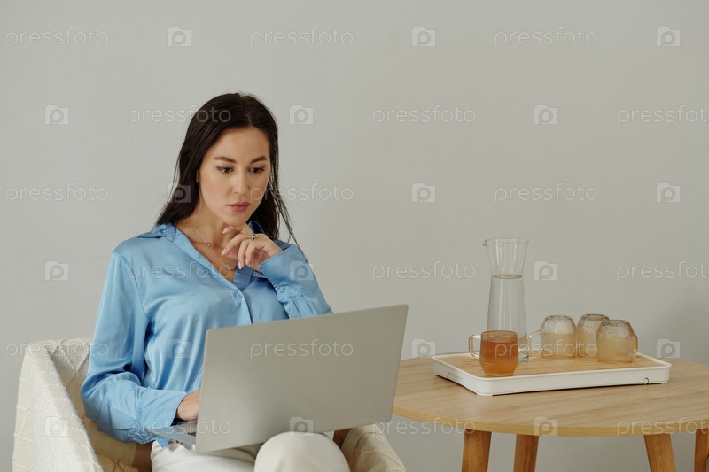 Женщина в синей рубашке работает на ноутбуке