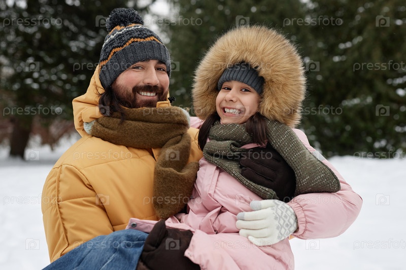 Счастливый отец, обнимающий дочь зимой