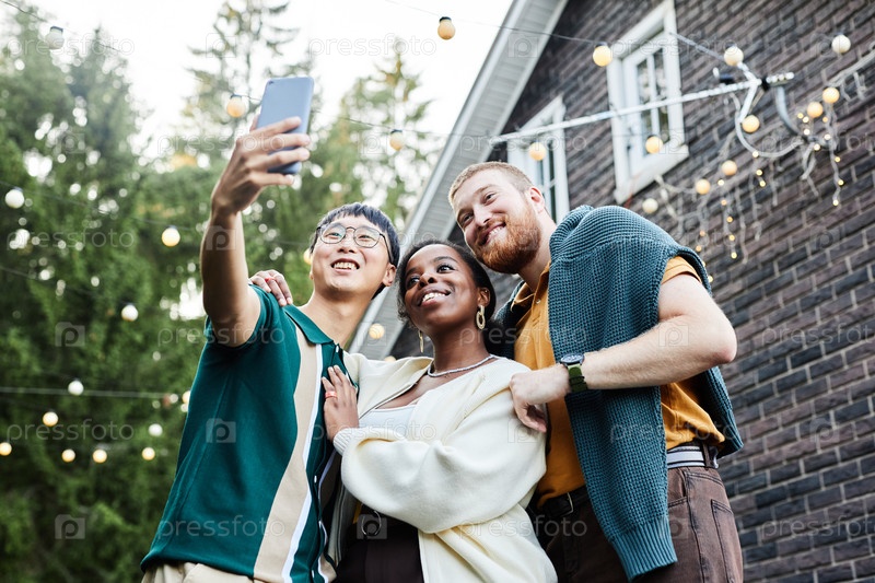 Друзья с низким углом, делающие селфи на свежем воздухе