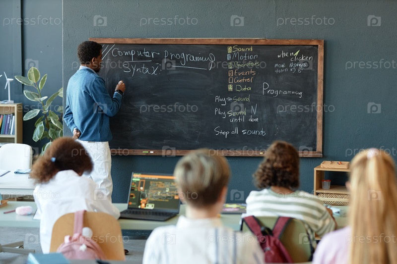 Широкоугольный вид класса с чернокожим учителем-мужчиной, пишущим на доске