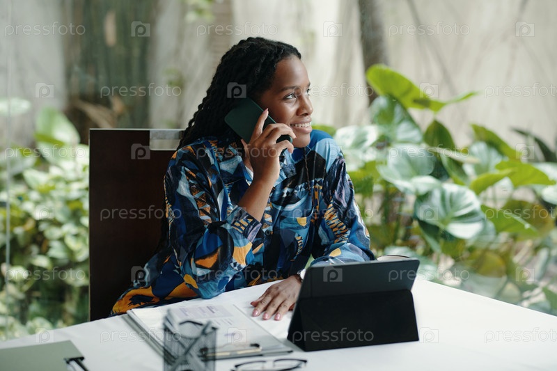 Улыбающаяся женщина разговаривает со смартфоном возле комнатных растений