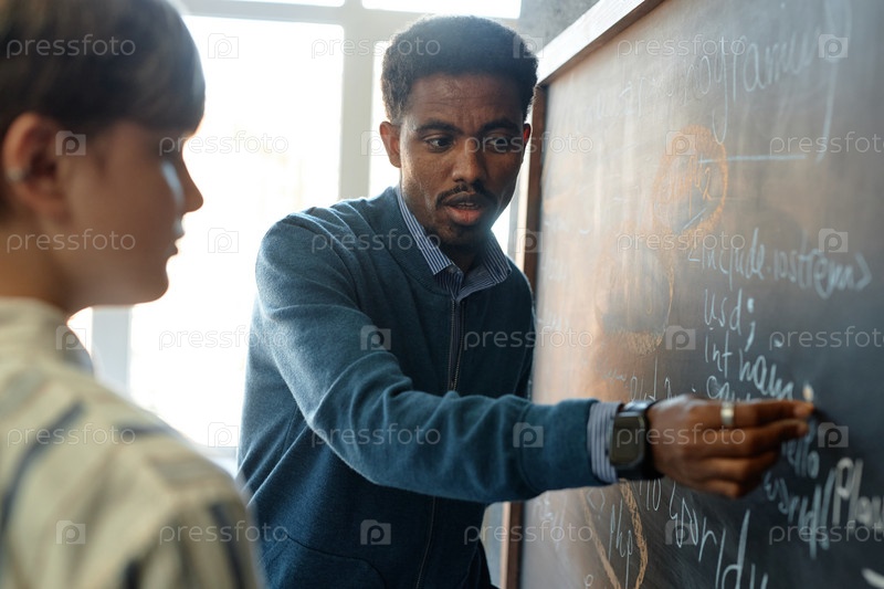 Чернокожий учитель пишет на доске, помогая студенту