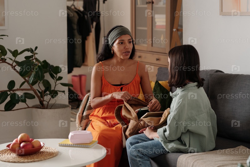 Мать ведет серьезный разговор с дочерью в гостиной
