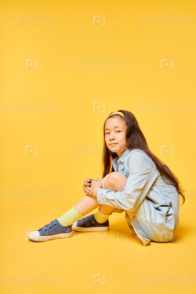 Улыбающаяся юная азиатская девушка в рубашке и кроссовках с желтыми носками сидит в жёлтой студии