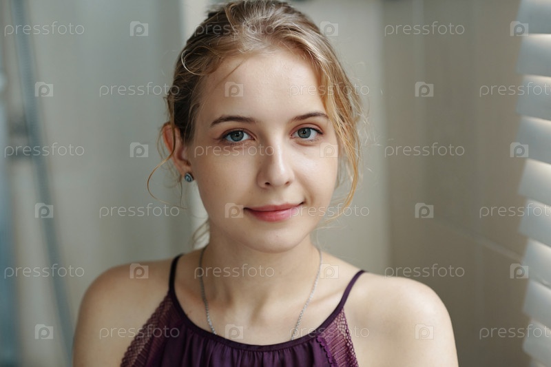 Портрет женщины, улыбающейся в непринужденной внутренней обстановке