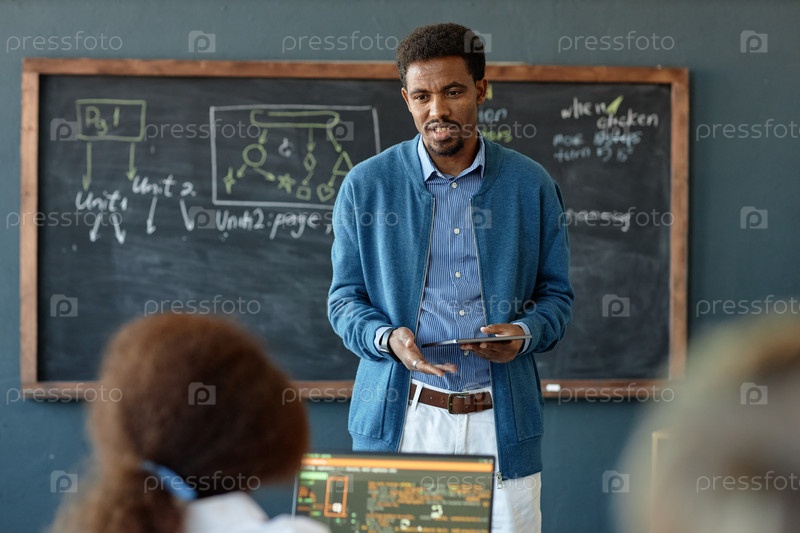 Чернокожий мужчина как учитель объясняет ИТ детям в классе