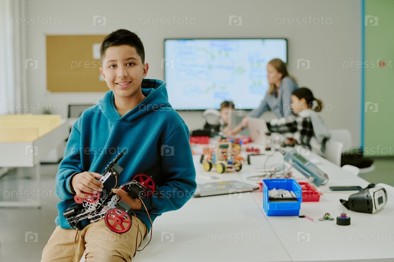 Улыбающийся мальчик с роботом, сидящим на столе
