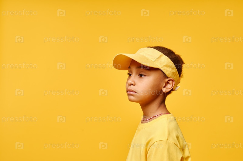 Претендентская чернокожая девушка позирует в открытой головной шляпе на желтом фоне в студии