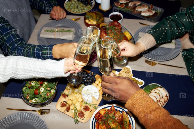 Руки людей, стучащих бокалы с шампанским на домашнем обеде во время празднования Рождества