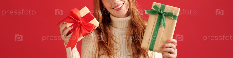 Улыбающаяся женщина держит подарочные коробки с красными и зелеными лентами