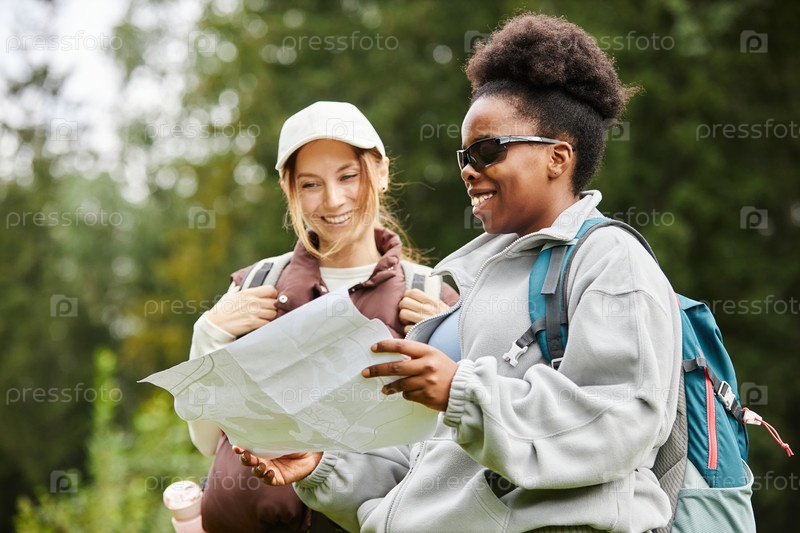 Две женщины смотрят на карту, ходят в поход