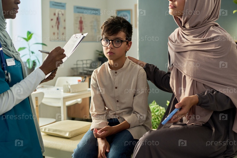 Мусульманский врач осматривает молодого мальчика с обеспокоенным родителем в клинике