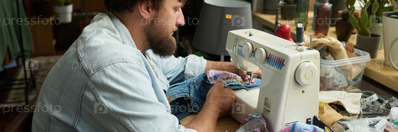 Сшивая новый карман в синие джинсы