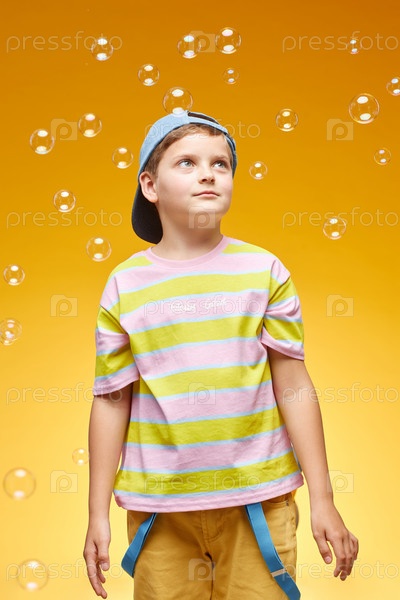 Портрет маленького мальчика, глядящего на плавучие мыльные пузыри во время стояния в Оранжевой студии
