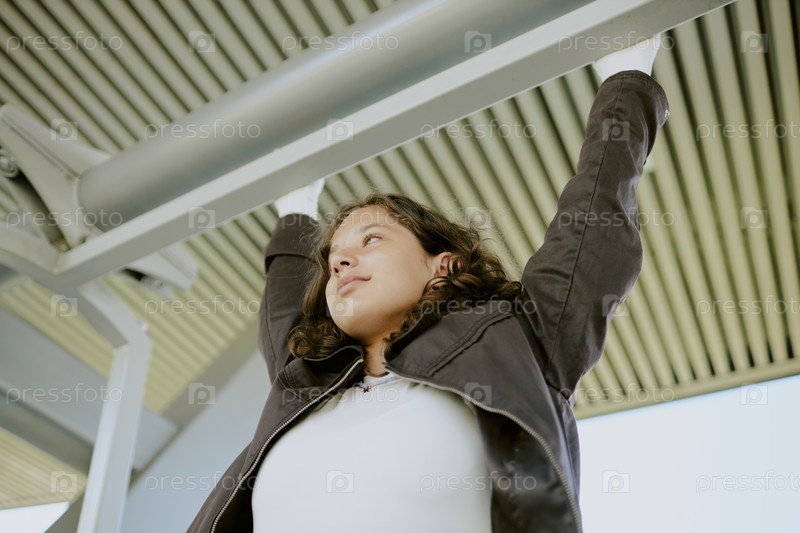 Подростковая девушка висит на балки