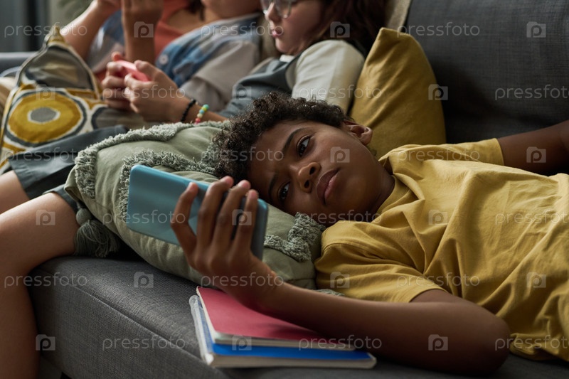Расслабляться на диване, используя мобильный телефон