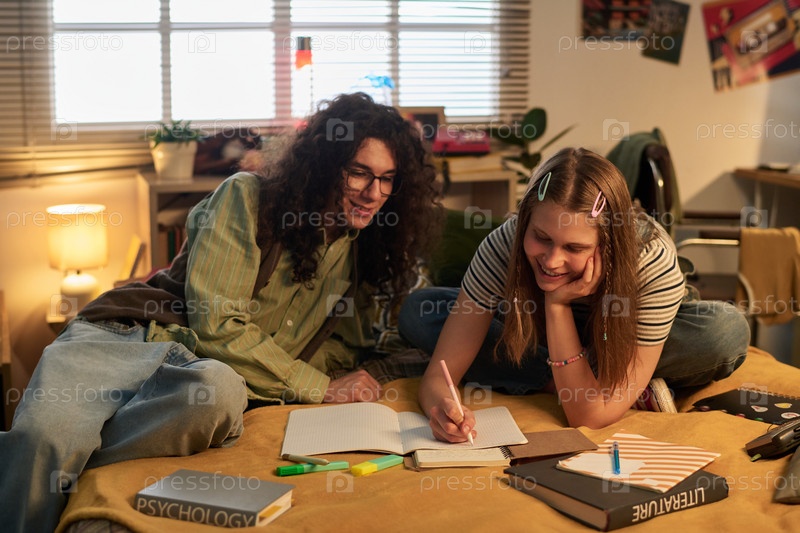 Улыбающиеся ученики работают над домашним заданием в уютной комнате