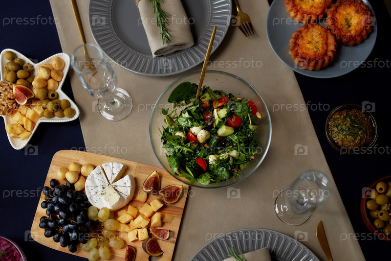 Высокий вид миски с салатами и фруктовой тарелкой, подаваемой на стол для рождественского ужина