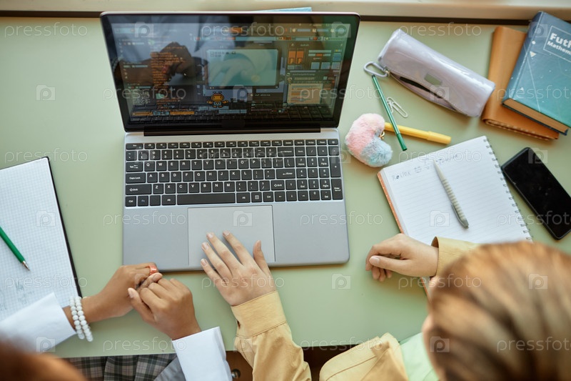 Два ребенка, использующих ноутбук для учебы на классном столе с канцелярскими принадлежностями